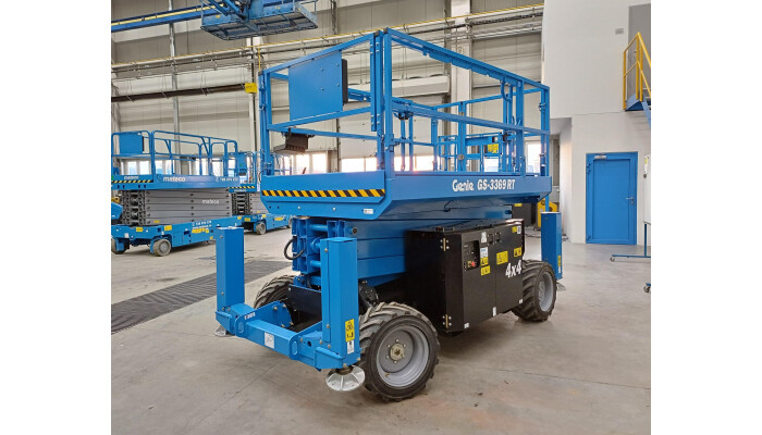 The Genie® GS™-3369 RT rough terrain scissor lift is built for extra-rugged performance and is able to traverse through uneven rough terrain environments.
