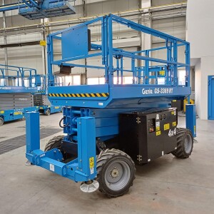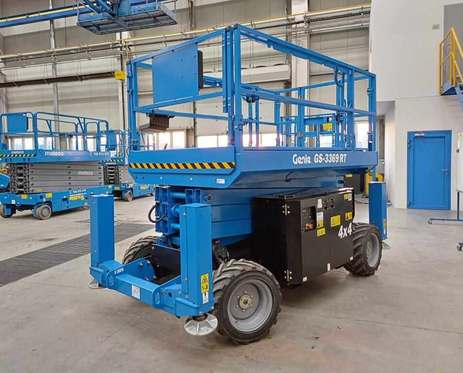 The Genie® GS™-3369 RT rough terrain scissor lift is built for extra-rugged performance and is able to traverse through uneven rough terrain environments.