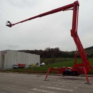 Special features and advantages of the BLUELIFT SA 31 spiderlift are top performance data in combination with the probably world’s most compact dimensions in basic position. Up to 31 meters working height and maximal 17,3 meters outreach (at 120 kg) are at the disposal of the operator. Regarding this new development, the clearance width of 1 meter should especially be emphasized. In combination with a clearance height less than 2 meters, the tracked spider lift can easily pass through each single-leaf industrial door. This is totally unique as the competitors always need a double-leaf door. Due to its important manoeuvrability resulting from the short overall length of only 5,75 m, the SA 31 offers a high advantage regarding usage in winding and inaccessible spaces.