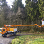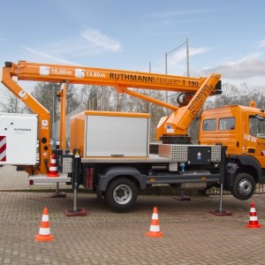 The T 190 has a working height of 19.0 m with a maximum lateral reach of 13.8 m, even at full (350kg) cage load capacity. The 185° swiveling range of the movable jib (RÜSSEL ®) provides maximum agility. Trees, buildings, and pipelines / cables are accessible in no time at all.